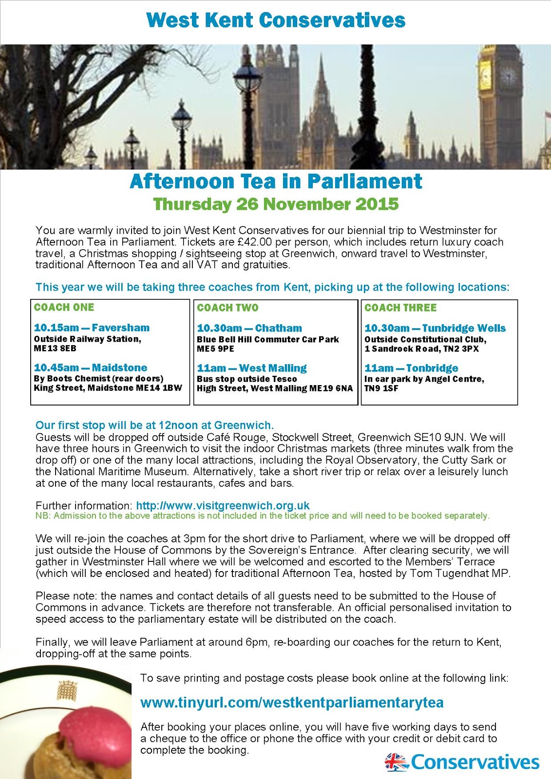 As with all events organised by West Kent Conservatives, the profit will be redistributed to the five local Conservative Associations in proportion to members attending.